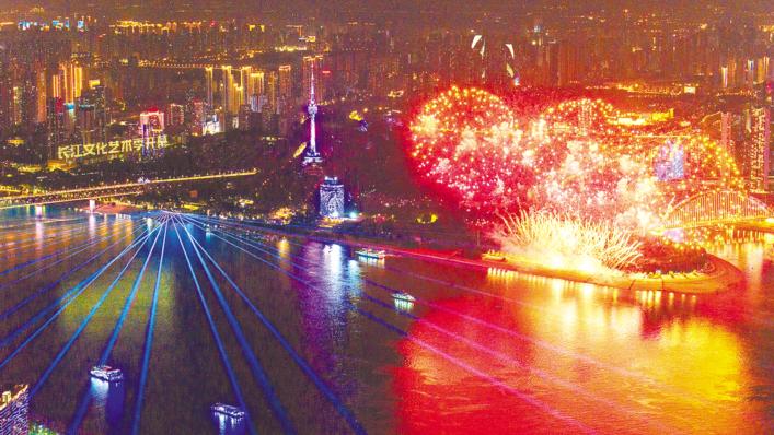 9月14日晚,燈火璀璨、光影交織,長江文化藝術季開幕式在武漢兩江四岸壯麗上演。(湖北日報全媒記者 何宇欣 攝)