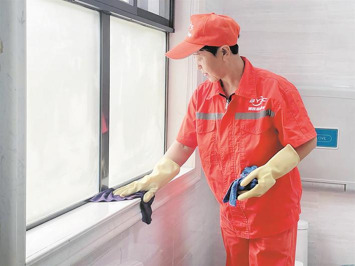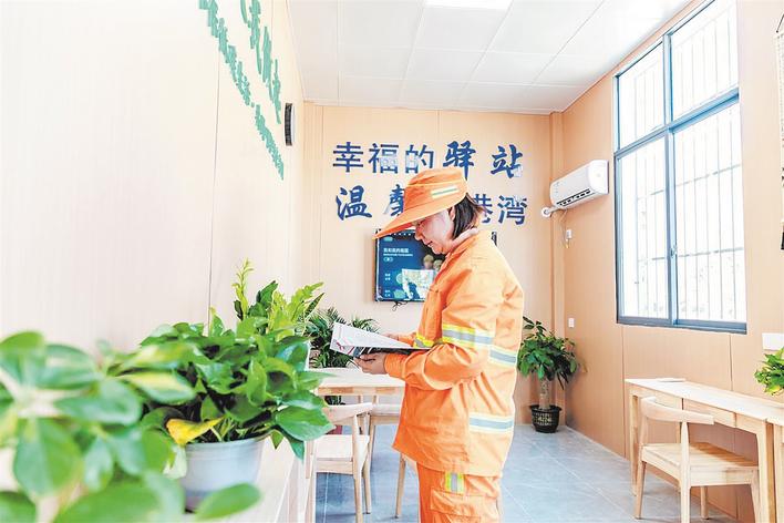 環(huán)衛(wèi)工人在城市驛站公廁閱讀