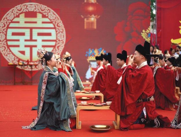 親迎禮、出閣禮、交拜禮、卻扇禮、合巹禮、婚書盟誓、執手禮、告天之禮……新人們在主持人的引導下,一步步沉浸式體驗宋制婚嫁儀式,共同翻開人生幸福新篇章。