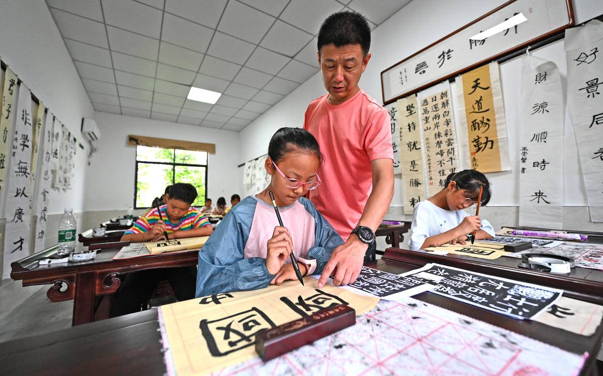 2024年7月10日,荊州市荊州區(qū)八嶺山鎮(zhèn)新灣村新時(shí)代文明實(shí)踐站熱鬧非凡,村里的孩子走進(jìn)鄉(xiāng)村“書法大講堂”,開始別樣的暑假生活。(湖北日?qǐng)?bào)全媒記者 劉曙松 攝)