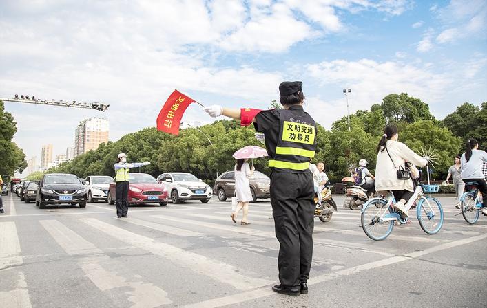 在交通路口、大街小巷等處,黃石文明宣導員開展文明宣導,讓文明創建融入群眾生活。