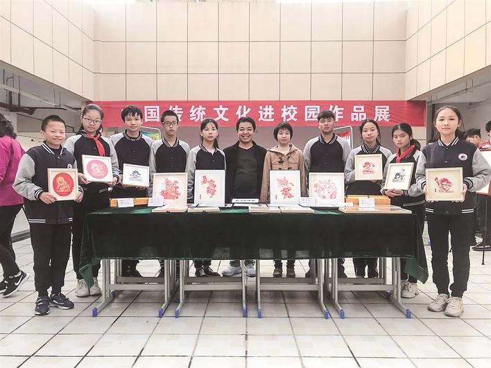 葛海(中)和學生參加傳統文化進校園作品展 通訊員供圖