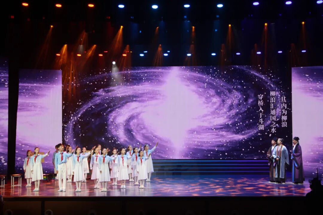 “楚韻傳薪”篇章聚焦文化接續,以童聲啟智、以科技賦能、以青春立志。荊州市機關幼兒園的《萱草花》,以清越童聲搭配點點發光球燈的溫馨演繹,讓文化基因在幼小心靈悄然扎根,最終將這份純真與傳承,自然升華為“知荊州、愛荊州、興荊州”的深厚情感共鳴;公安縣竹溪小學《柳浪湖畔的AI奇遇》則穿越古今,當AI虛擬的“公安三袁”與小學生對話,傳統文化在科技賦能下煥發新生;壓軸之作《荊楚頌》由荊州中學與荊州實驗小學學子聯袂呈現,學子們以激昂朗誦為載體,將楚人篳路藍縷的開拓精神、眾志成城的抗洪精神、薪火相傳的紅色精神深度交織,更融入綠色發展觀與長江大保護的時代理念,生動展現出青少年對荊楚文化精神與時代使命的當代認知。