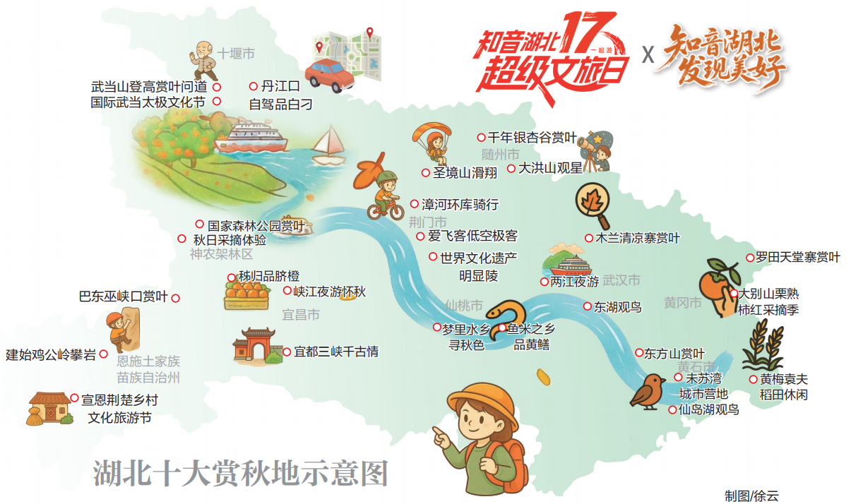 本次活動(dòng)重磅發(fā)布的十大賞秋地,是經(jīng)省文化和旅游廳與湖北日報(bào)傳媒集團(tuán)“發(fā)現(xiàn)美好”聯(lián)合項(xiàng)目組推薦、精心篩選而來。十大目的地分別是:武漢(東湖觀鳥、兩江夜游、木蘭清涼寨賞葉);黃石(東方山賞葉、未蘇灣城市營地、仙島湖觀鳥);宜昌(峽江夜游懷秋、秭歸品臍橙、宜都三峽千古情);十堰(武當(dāng)山登高賞葉問道、國際武當(dāng)太極文化節(jié)、丹江口自駕品白刁);黃岡(羅田天堂寨賞葉、大別山栗熟柿紅采摘季、黃梅袁夫稻田休閑);隨州(千年銀杏谷賞葉、大洪山觀星);荊門(圣境山滑翔、世界文化遺產(chǎn)明顯陵、愛飛客低空極客、漳河環(huán)庫騎行);恩施(巴東巫峽口賞葉、建始雞公嶺攀巖、宣恩荊楚鄉(xiāng)村文化旅游節(jié));仙桃(魚米之鄉(xiāng)品黃鱔、夢里水鄉(xiāng)尋秋色);神農(nóng)架(國家森林公園賞葉、秋日采摘體驗(yàn))。