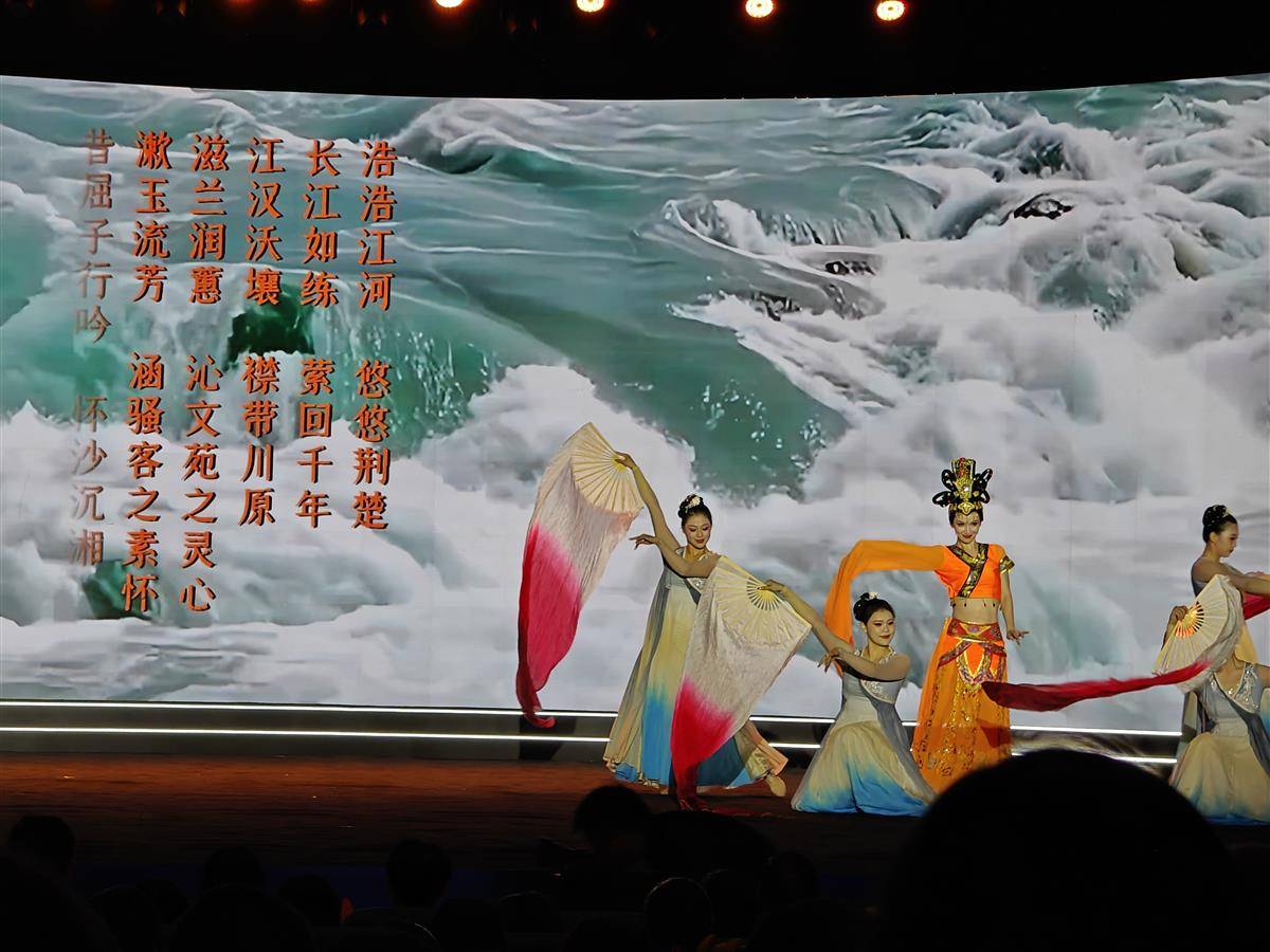 晚會以暖場專題片《長江:文學之河》開篇,循著江流脈絡展現長江與文學的相映相生,帶領觀眾沉浸感受“長江是文學追夢人的追溯與召喚”。在序章《江河所賜》中,舞蹈與編鐘古琴交織,詩歌與影像交融,荊楚文脈在光影中流淌。