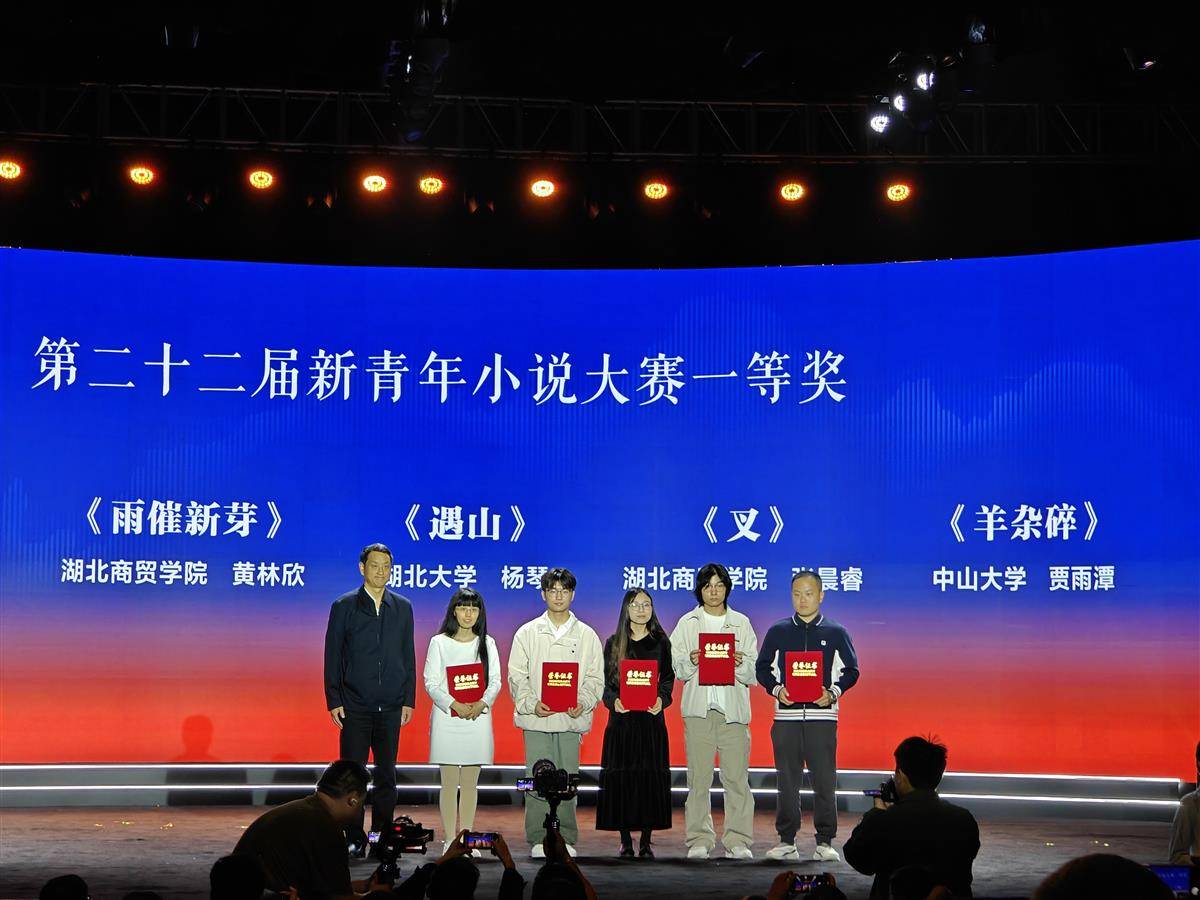據了解,晚會現場發布的獲獎作品中,由湖北省作家協會、湖北省學生聯合會和湖北大學聯合主辦的第二十二屆新青年小說大賽共征得稿件352篇。經評委評審,湖北大學楊琴《遇山》等5篇作品榮獲一等獎,8篇作品榮獲二等獎,10篇作品榮獲三等獎;武漢大學等8所高校獲“優秀組織獎”,吳昊琳等8位教師獲“優秀指導教師”稱號。
