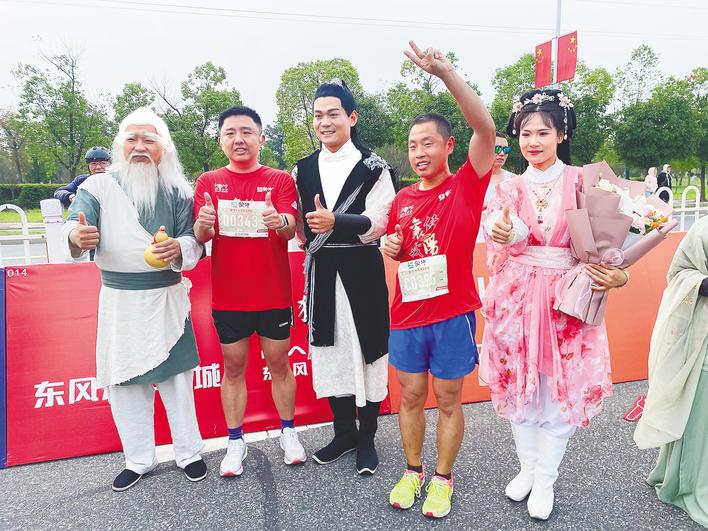 11時10分,江西跑友夏劍平和熊凌蕓脫下比賽裝束,換上一身漢服,漫步在唐城景區拍照留念。一場馬拉松,成為他們認識襄陽、愛上襄陽的起點。