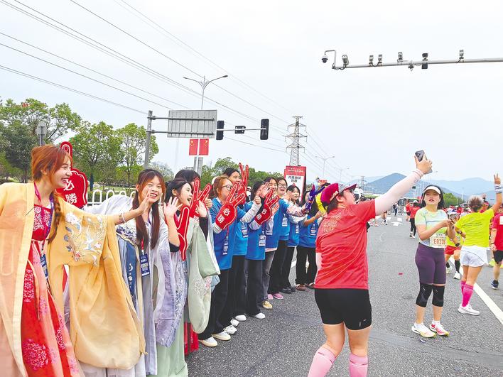 為了這場盛會,整座城市都被動員起來。在賽道沿線,鄧小玲抱著2歲的孫女為選手加油鼓勁,社區群眾組成的啦啦隊鑼鼓喧天,企業員工自發組織熱情吶喊……湖北文理學院大四學生姜東方第二次參加襄馬志愿服務:“希望用我的熱情,讓每一位跑友感受到襄陽城市的溫度。”