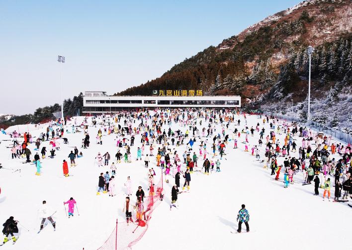 通山縣九宮山滑雪場雪道上人頭攢動,眾多游客在此盡享滑雪樂趣。