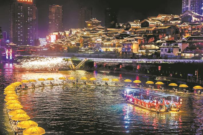 夜幕降臨,宣恩縣貢水河畔燈火璀璨,“龍游貢水”游船載著游客穿梭于光影之間