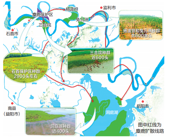1996年起,石首麋鹿開始從保護區向外擴散,部分順長江北岸向東進入小河口鎮楊波坦村黑瓦屋長江故道洲灘,再東拓至監利境內兔兒洲,這兩個麋鹿種群有600余頭。1998年長江枯水季節,保護區部分麋鹿南渡長江,抵達石首東升三合垸洲灘扎根繁衍,種群數量近600頭。其中11頭由石首調關鎮沿河流南下湖南華容終南鄉,最后8頭到達洞庭湖畔。
