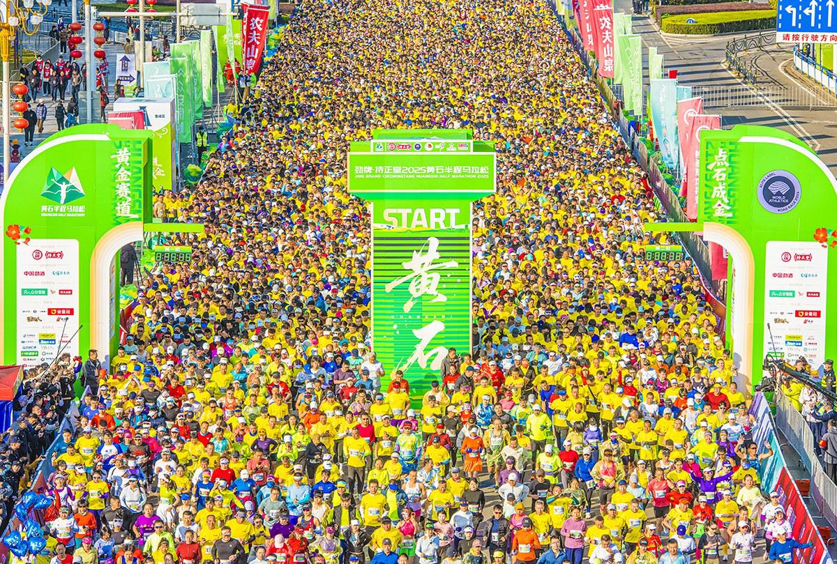 14日,2025黃石半程馬拉松在人民廣場鳴槍開跑。
