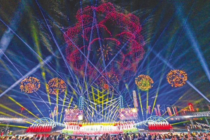9月11日晚,4000架無人機閃耀長江夜空,與舞臺演出、江面焰火聯動,呈現“江豚逐浪”“花開中華”等震撼畫面。(湖北日報全媒記者 薛婷 攝)