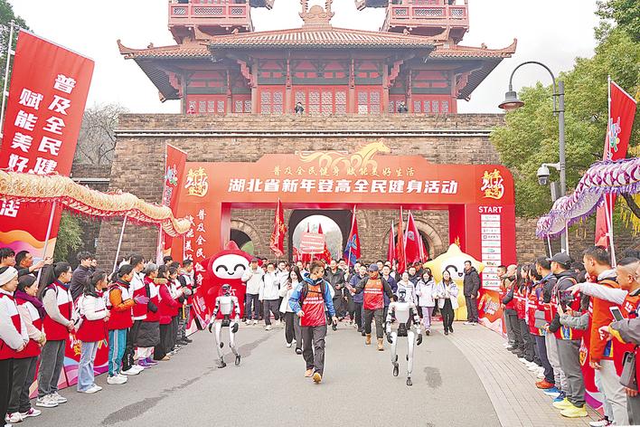 12月30日,第18屆湖北省新年登高全民健身活動在武漢東湖磨山風景區舉行。兩臺人形機器人化身“活力陪走員”,成為現場矚目的科技明星。(湖北日報全媒記者 童軍鵬 何旭峰 通訊員 邱亞娟 攝)