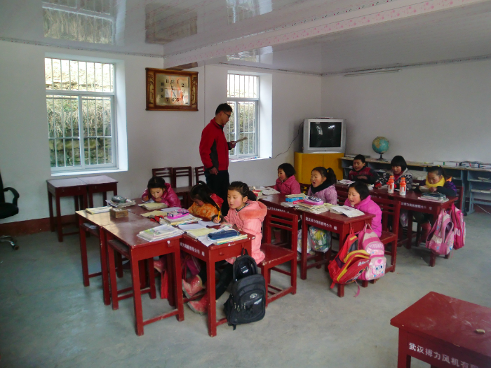 來到姜家灣教學點當天,袁輝沒有床,他在教室的角落里用8張書桌拼成了一張“床”,鉆進睡袋入睡。教學點在半山腰,離縣城有3個小時車程,沒有電視和網絡,也沒通自來水。