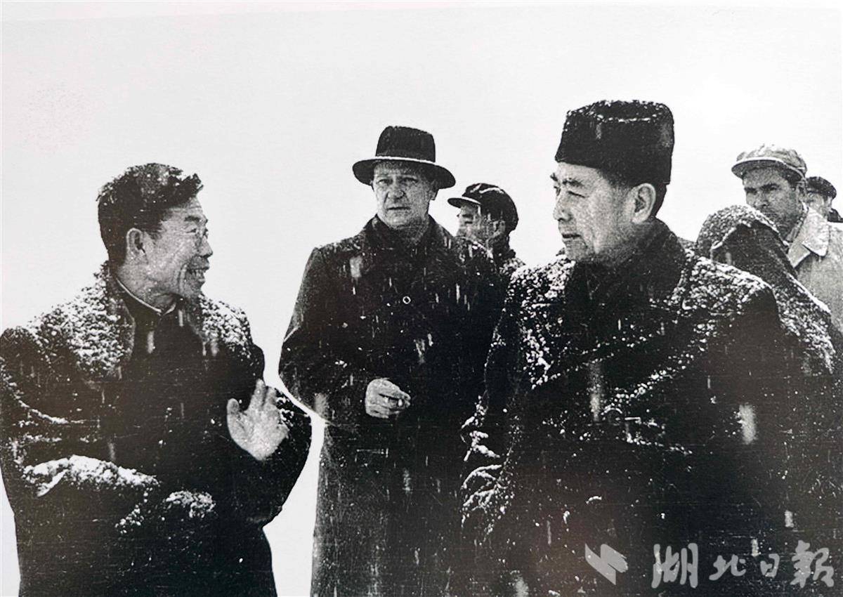 1958年2月底周恩來冒著大雪考察荊江大堤。(湖北日?qǐng)?bào)記者 張其軍 攝)