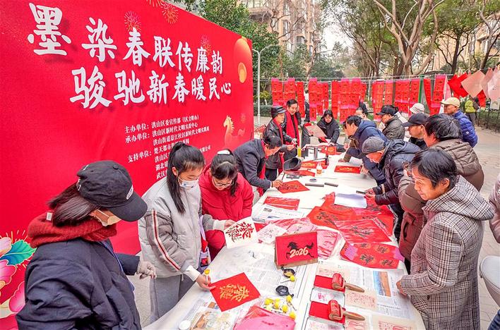 紅紙鋪開,墨香四溢。1月17日上午,武漢市洪山區洪山街道景江社區027小區小廣場上,“墨染春聯傳廉韻 駿馳新春暖民心”新春送福活動熱鬧開場,為即將到來的馬年春節增添了濃濃的年味。活動現場,書畫創作者們凝神靜氣,揮毫潑墨,免費供社區居民挑選。