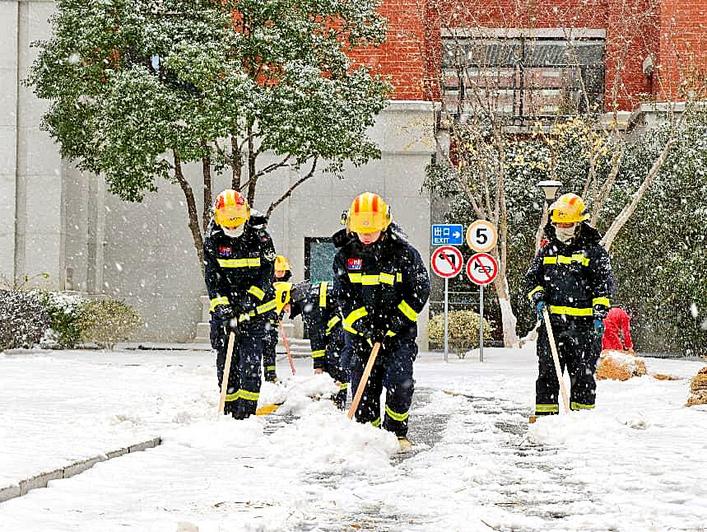 20日上午,武漢市消防救援支隊漢南大隊消防員走進洪山未來學校、經開外國語學校、軍山科技小學等地開展鏟雪除冰工作,保障師生出行安全。