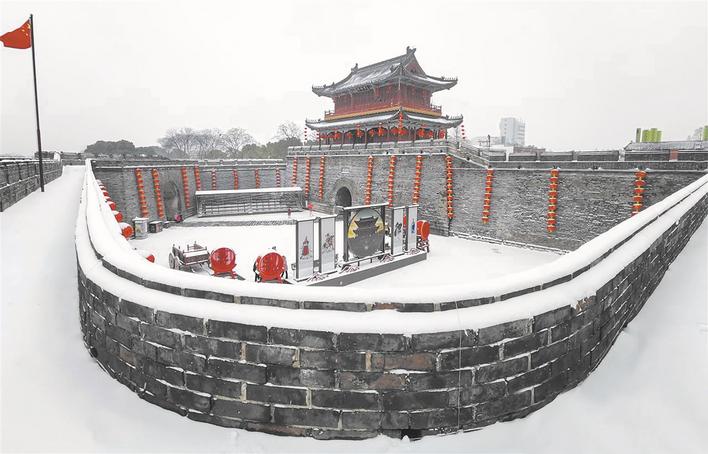 1月20日,雪落荊州。航拍鏡頭在雪中飛行,將焦點定格古城東門賓陽樓。11.28公里古城垣自此延展,青灰城磚被薄雪輕裹,磚縫間的歲月肌理在風雪中愈顯蒼勁,如銀帶般蜿蜒環抱東門盛景。(楚天都市報極目新聞記者黃志剛攝)