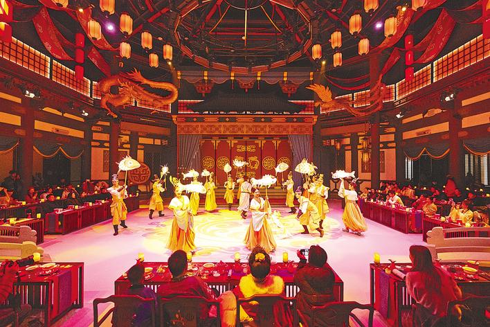 1月19日,位于武漢市漢陽區龜山公園的知音殿啟動試運營,游客一邊品嘗美食一邊沉浸式體驗三國主題表演。這座融合千年知音文化與現代文旅體驗的新地標,成為武漢城市更新中“微改造、精提升”的又一鮮活案例。(湖北日報全媒記者 何宇欣 攝)
