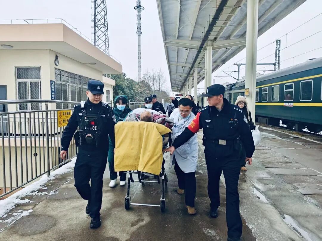 當日13時許,K8089次列車雖然晚點到站,但應城站派出所民警早已在站臺等候。民警迅速與值乘該列車的武漢乘警支隊民警王漢濤對接,詳細了解這名85歲旅客的身體狀況、發病過程及既往病史等關鍵信息。在列車工作人員配合下,民警與醫護人員默契協作,小心翼翼地將高齡患病旅客從列車上抬下,平穩轉運至等候在旁的急救車內進行初步檢查。整個轉運過程銜接緊密、高效有序,路地警力聯動順暢,警醫協作無縫銜接,為85歲老人的緊急救治爭取了最寶貴的黃金時間。