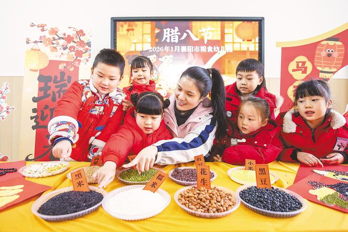 1月23日,在襄陽市糧食幼兒園,老師正在教小朋友認識制作臘八粥的食材。