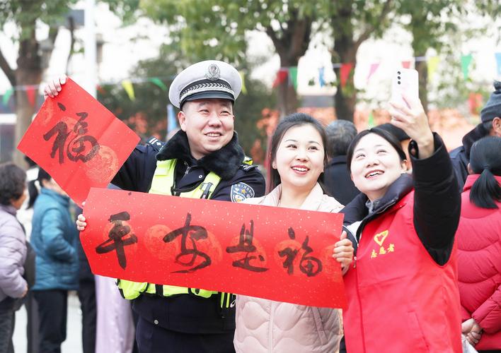 日前,荊門市東寶區仙居鄉年貨大集熱鬧開集。集市上,當地交警開展“送春聯話平安”主題活動,將交通安全宣傳融入傳統年俗,為群眾送上美好的平安祝愿。(農村新報 通訊員 趙平 談媛媛 攝)